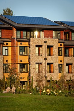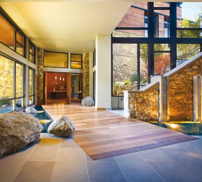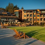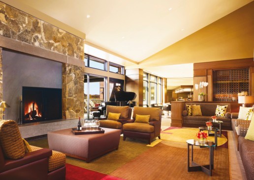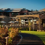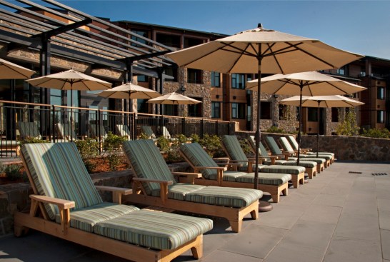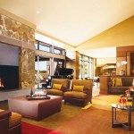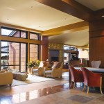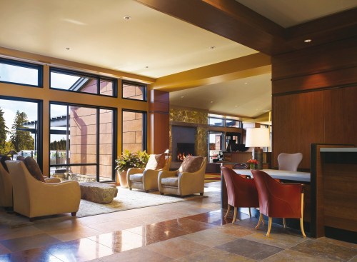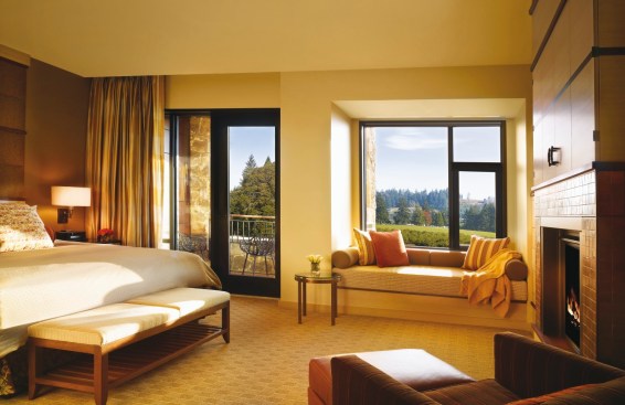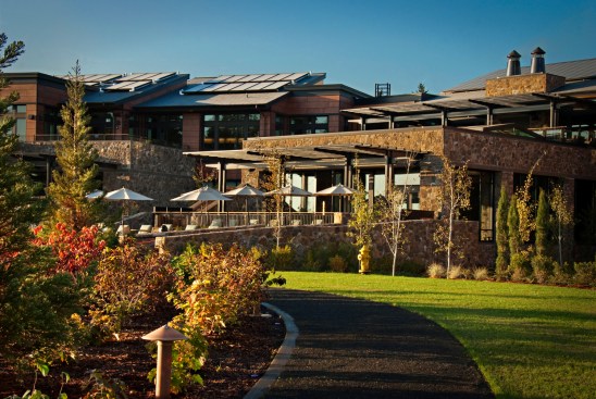 The lobby reflects the rugged beauty of the natural surroundings with reclaimed limestone floors, slate and a rich combination of Northwest woods. Adjacent to the lobby area and restaurant is the cozy great room featuring a massive two-sided stone fireplace. Guests can admire the view inside and out while sipping a drink at an adjoining bar. Large shade trees greet arriving guests who also enjoy territorial views of the nearby mountains and meadows, from the vineyard-lined entry drive.