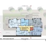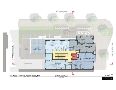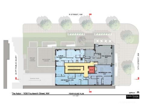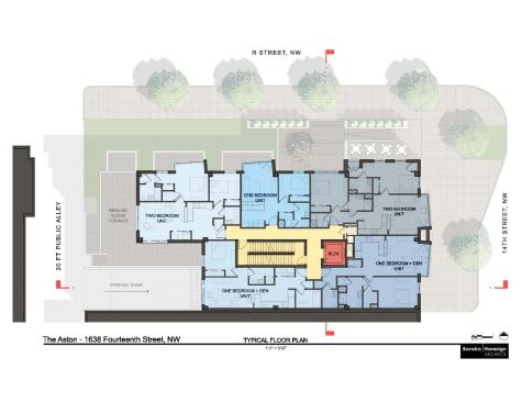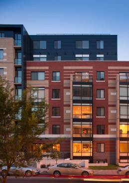 Design Solution: The project design organizes 3 distinct building blocks that respond to varied historic context. The first mass, articulated in buff colored masonry, akin to the 1920’s limestone buildings of the ‘Automotive era,’, is symmetrically composed with punched windows flanking a richly articulated bay window. This window is ‘butterflied’ about its center to enhance views to the north and south along the commercial uses on 14th Street. A metal shell wraps this building block in the north-south direction and bends to form a signature crowing element. The metal cornice announces the building’s residential use, providing an iconic cap along 14th Street. A second masonry mass steps down to respond to the rhythm, height and proportions of the historic Wardman Row. Aluminum and glass bay windows are angled towards the residential neighborhood while being anchored to the masonry by creased masonry wings with playful portal windows allowing glimpses of the lively commercial street to the east. The third mass of dark colored panels rises above the 2nd mass and completes the 3-part composition.