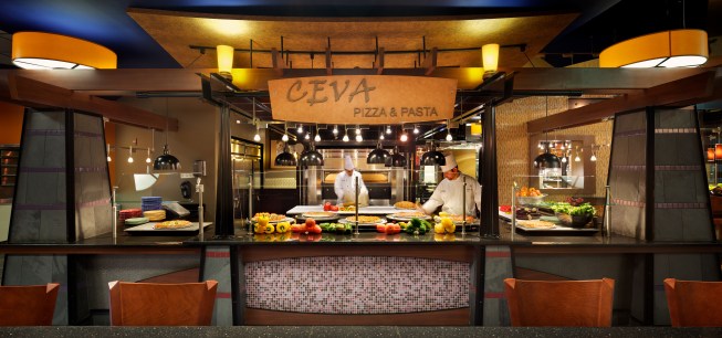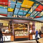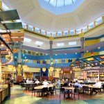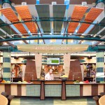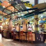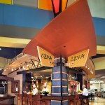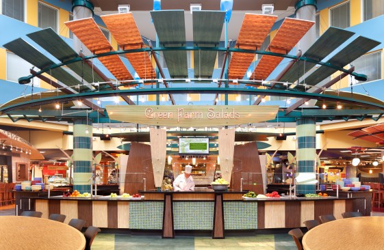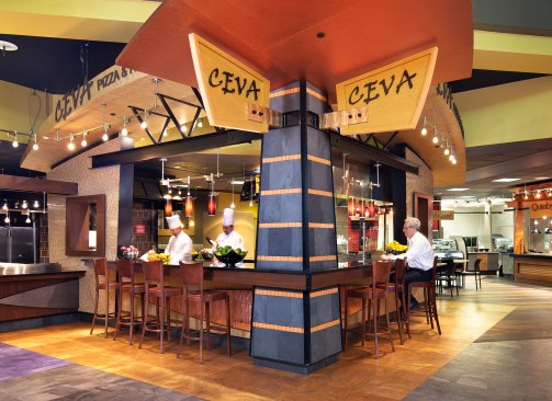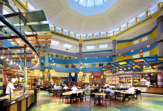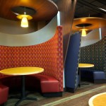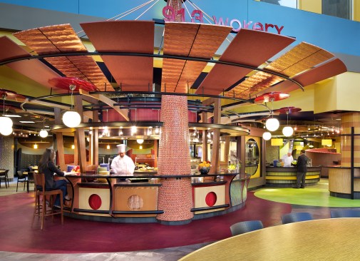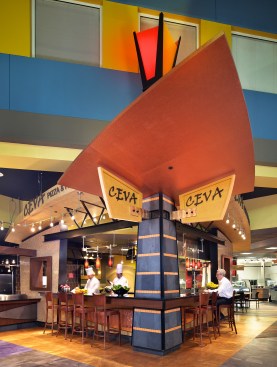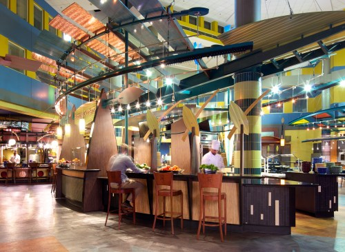The project program included a renovation of the serving and seating areas, but required maintaining the existing kitchen. The final design offers a destination dining concept with eight distinct dining locations. Each station represents its own experience and personality with its own food, style, colors, and forms. Besides the unique qualities of the forms and colors, there is a variety of seating postures offered, including tables and chairs, booths, banquettes, and counter seating where guests could watch the chefs’ work.