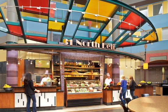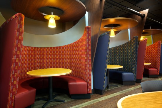 The main objective was to transform the dining facility into an interactive dining space to showcase a variety of food choices and provide an environment that doubled as a social space for student and teacher gatherings. The design team created an original, lively, and energetic design that changed the use of space and the functionality of the food service program on campus.