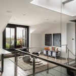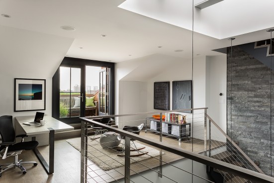 At the top level, a home office opens onto a private reading terrace in a new dormer, and overlooks the atrium and entry below. Across the atrium is a media room, a guest bathroom and stairs to a renovated roof deck. The roof deck, with 360 degree views of the city, stainless steel kitchenette, gas fire-pit, and built-in Ipe banquettes make it the perfect space for evening entertaining.