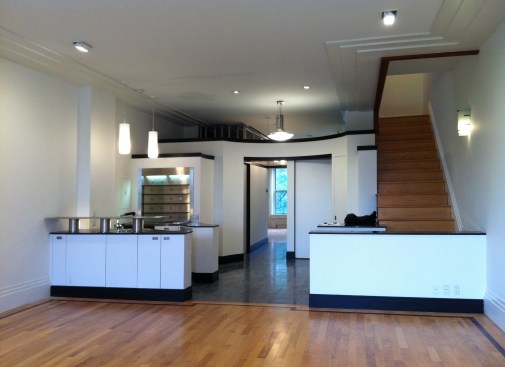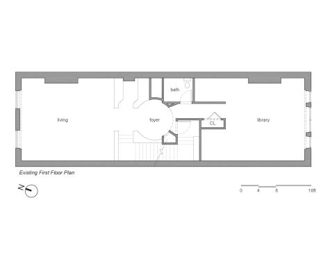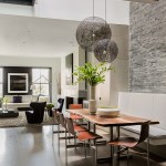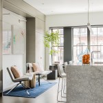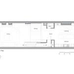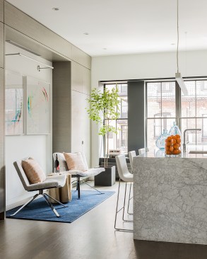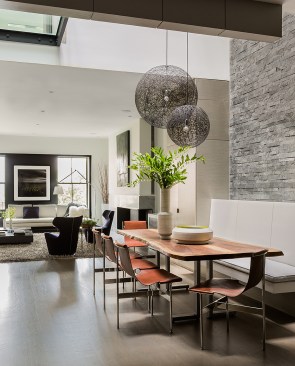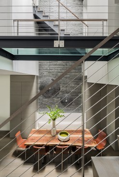 The bright, sun-lit atrium that greets the visitor to this Back Bay townhouse is a welcome contrast to the building’s brooding 19th century entry and common hallway. A skylight 38’ above the entry bathes the dining table and banquette at the center of the apartment with natural light, and plays across the three story dry-laid gray schist wall. A gleaming kitchen and a warm, modern living room open out to either side, and a powder room hides behind panels of reconstituted gray wood veneer. Where there used to be partitions, the space now flows uninterrupted from the front to the rear of the building.