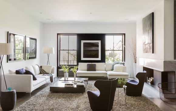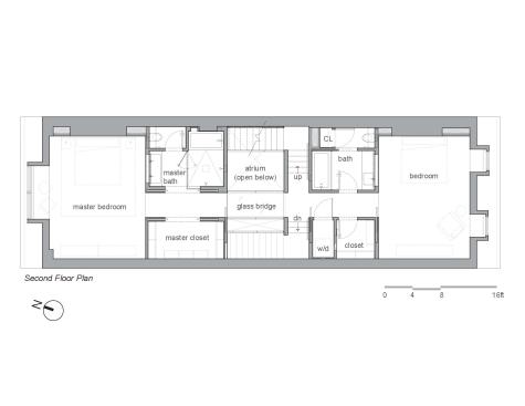 On the second floor, a transparent glass bridge spans across the atrium, connecting two bedroom suites and permits light to penetrate down to the entry level. At the master suite, parting pocket doors allow the master bathroom, detailed in cool Carrara marble and dark wood veneer, to flow into the bedroom and dressing room.