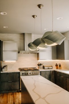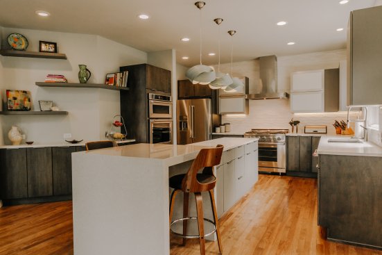 The homeowner here was looking for a modern update to her home, beginning with the kitchen, which later became a catalyst for the rest of the home. The kitchen was a focal point of the house and was requested to be updated and made to feel more welcoming. The client, an artist, requested a neutral palette so she could highlight with accessories, including lights and brown base cabinets to really give that "pop" of color. We ran into a few significant challenges during the remodel. The existing plumbing had to be moved to accommodate the new and improved kitchen design which is quite common in remodel. The plumbing had to be moved within the soffits and floor areas, which allowed the kitchen to transform to more of an open concept for a better flow for both cooking and gathering. The homeowner added additional painting and electrical work which added extra time, as did the more elaborate lighting fixtures which significantly increased the lead time. The finished product was an exquisitely designed kitchen and our client was blown away. We added a larger oven with a hood vent that vented outside rather than recirculating in the home. The homeowner absolutely loved the custom display shelving as she now has a place to display her artwork. The new kitchen design has provided a better cooking and entertaining space while also creating shelving space for artwork which was the focus for our client. Designing a remodel for an artist can be quite challenging but at Denver Design Build, we too take an artistic approach to all our designs. The homeowner has since received many compliments on her new space that she is happily enjoying.