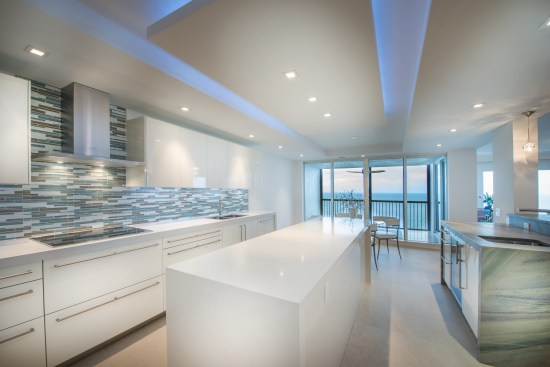 We dug into the building drawings and found a sanitary waste stack in the residence next door that might have be an option. We had to verify the capacity of the stack, and then get approval from this home owner and just maybe, it will work. We got approval; we did some selective demo behind their bathroom shower and determined that we could make it work but it would be tight. All that was left was to core through a 12” concrete wall and come through at the right spot. It was a challenge….the team kept pushing for the Vision and we are glad that we were able to make it happen. The final effect was breathtaking! Our client has a one of kind kitchen at the Biltmore in Bay Colony, Naples.