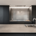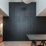 On the ground floor, all serving spaces were centralised in the core of the house. This core was given a black wooden finish, giving it the appearance of a custom-made cabinetry on all sides. The core houses a spacious storage room with walk-in fridge, a laundry room, the stairwell, a toilet and access to the basement.