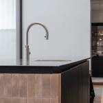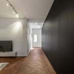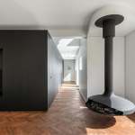Life is lived around the core. A spacious kitchen was installed at the rear of the house. A new window section at the height of the dining table covers the entire height of the rear façade and provides additional daylight on the ground floor while bringing daylight and a nice view through the void to the home office on the upper level.