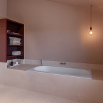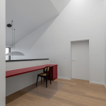 To extend the feeling of space and openness upstairs, the existing attic was partially removed. The night hall was opened up to the ridge and the bathroom and parents’ bedroom were also given higher ceilings. In contrast to the shower room on the ground floor, the bathroom on this level was given a hot pink finish. The wine-red cabinets are a contrasting eye-catcher. The spacious walk-in shower was placed behind the bathroom cabinet and finished with a terrazzo tile that reflects all the colours of the bathroom.