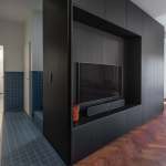 On both sides of the kitchen we find a living space. On one side, a more intimate space, ideal for playing video games or reading a book. On the other side, a bright sitting area with a large dining area for visitors. This room received an additional decorative element in the form of a focus fireplace. Both living areas, together with the front hallway, were given herringbone parquet flooring. The kitchen received a low-maintenance tile. Inside the black core, a contrasting blue tile was chosen.