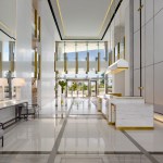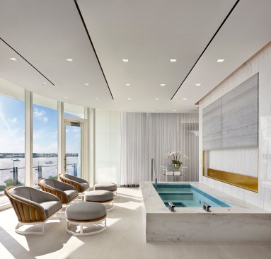 The Bristol offers a bespoke collection of luxury amenities for residents. The elegant two story lobby features white marble with brass architectural detailing and opens to a lushly-landscaped waterfront terrace. The main salon provides an elegant and comfortable space for residents to meet, while an adjacent card room offers space for games and events. A private beauty suite and business center rounds out the amenity program on the main level. On the second floor, a well-appointed fitness center with separate men’s and women’s spas connects to a south-facing pool and sun deck.