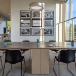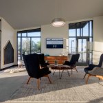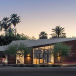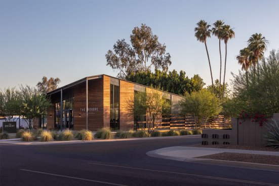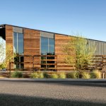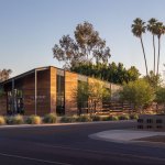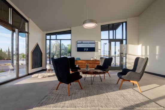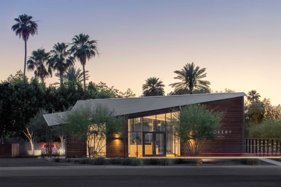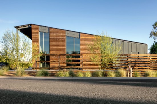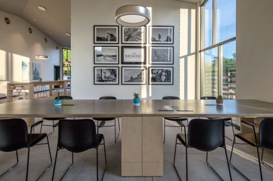 The Brokery straddles the boundary of where work and life collide. The real estate office and co-working space stands next to a small strip retail center in a Central Phoenix neighborhood. It offers the homey comforts of a front porch, living room, kitchen and community table bundled with modern office technology. Open plan spaces for co-working are complemented by three smaller office and conference rooms. An island reception desk provides a necessary information center without isolating staffers from coworkers. Together, private and social function in an easy balance. The building takes its form from surrounding mid-century ranch houses; the design team manipulated its materials, shapes and systems to make the structure resource and energy efficient in a desert environment. As a signatory to the AIA 2030 Commitment, the team pushed toward carbon neutrality and minimal water use by employing durable, high-performance sustainable elements. All materials will withstand Phoenix’s extreme temperature changes and aridness. Through shrewd siting and massing based on their in-house energy models, Studio Ma expanded the Brokery’s window walls to their fullest extent while keeping construction costs at $309 per square foot, an average cost for the area. The building’s thermal comfort is safeguarded by pulling the roof into overhangs, which become porches on the south and east sides. These shelter the Brokery’s entrances. The west and north sides are shaded by nearby trees. Native plantings and a bioswale provide a xeric landscape. Each decision the team made tailors the building to its surrounding landscape. The exterior wood walls relate to neighboring houses. But this sympathy is most visible in the Brokery’s massing, which rises and falls like the nearby mountain ridges.