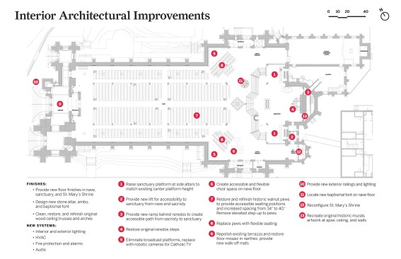 With the church’s original drawings lost, the architects used detailed laser scans to create a new 3D digital model of the building. New interior finishes maintained qualities of light and permanence, including new white and light grey marble floors throughout. The nave was reconfigured for greater accessibility while maintaining the overall seating capacity of 1,900, and the sanctuary was redesigned to remove elements from an overcrowded 1980s renovation. The architects designed a new family of liturgical appointments and furnishings, including millwork and artwork, for the church.