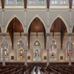 The wooden trusses carrying the ceiling were cleaned and sealed, with an earlier edge treatment of maroon paint replaced by gleaming metallic gold that emphasizes the church’s original detailing. New M/E/P systems, including energy efficient lighting, air conditioning, audiovisual, broadcast, and TV, have been seamlessly integrated within the building.