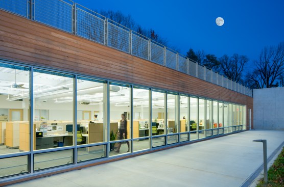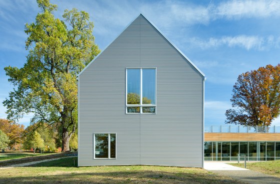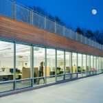 The new headquarters provides a respectful counterpoint to the historic structures. The large, open office space is nestled into the landscape to diminish the overall impact of the building on the site, while a green roof and terrace create strong connections between interior and exterior spaces. Conventional materials including wood siding and metal panel complement the use of stone and slate in the historic structures and evoke images of humble agrarian outbuildings.