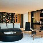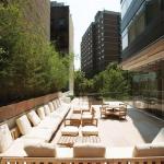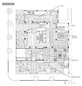 If the hotel’s volume is light and readable, the inside tells a different story. Antonio Citterio, the noted Milan-based designer, oversaw the hotel’s interiors and generated a warm atmosphere by coupling graphic patterns with traditional elements. A boldly abstracted foliage pattern covers the lobby and elevator walls, for example, and custom-designed furniture underscores the hotel’s contemporary aesthetic. Dark woods and slate subdue these moves. Corridors are narrow and dimly lit, and in the lower, public floors, they connect the different areas—lobby, restaurant, bar, terrace—in a series of byzantine circulations meant to encourage an interaction with the space. A garden, designed by Nathan Browning, stitches the spaces together.
