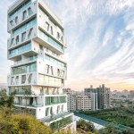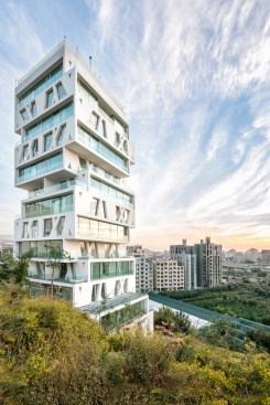 Thanks to the fixed core with lifts and staircases at the heart of the building, there are no constraints on the layout of the apartments. The floors run straight from the core to the facades, which are on each floor composed of two supporting concrete girders and two panoramic window frames, consequently rotated 90 degrees per level. Both the crossing girders and the core serve to stabilize the tower, an extra challenging task in a seismologically active area.