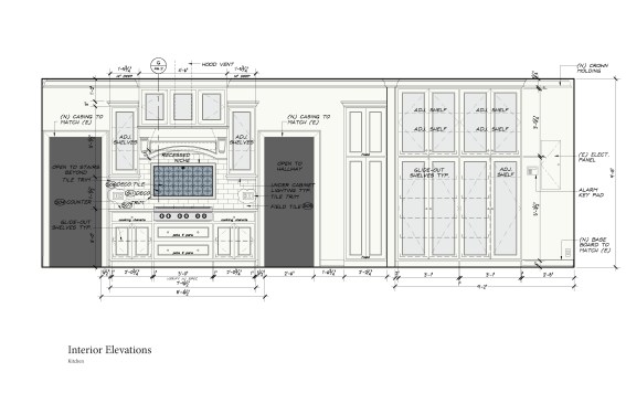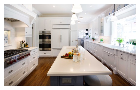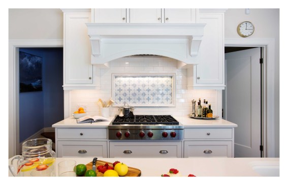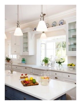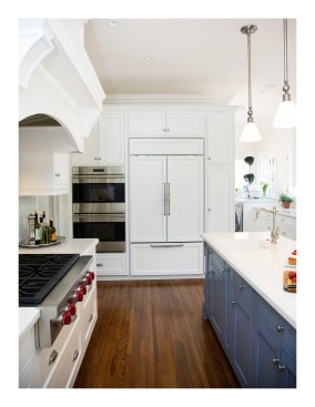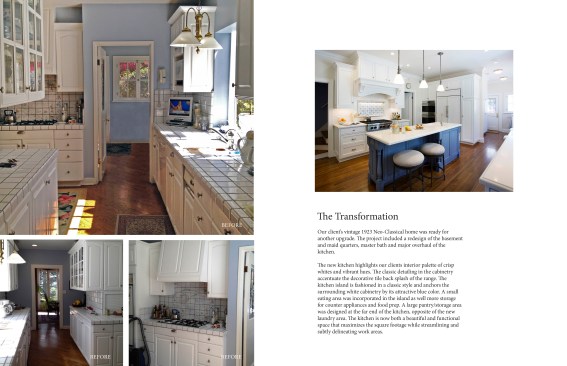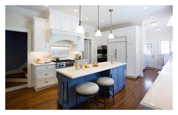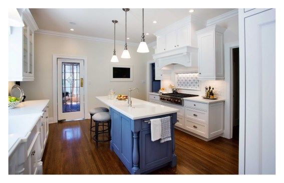 Our client’s vintage 1923 Neo-Classical home was ready for another upgrade. The project included a redesign of the basement and maid quarters, master bath and major overhaul of the kitchen. The new kitchen highlights our clients interior palette of crisp whites and vibrant hues. The classic detailing in the cabinetry accentuate the decorative tile back splash of the range. The kitchen island is fashioned in a classic style and anchors the surrounding white cabinetry by its attractive blue color. A small eating area was incorporated in the island as well more storage for counter appliances and food prep. A large pantry / storage area was designed at the far end of the kitchen, opposite of the new laundry area. The kitchen is now both a beautiful and functional space that maximizes the square footage while streamlining and subtly delineating work areas.