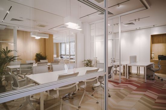 The colourful office floor, specially designed for this project, draws immediate attention and contrasts beautifully with the white furniture by Vitra. While the room is not exactly big it is made to appear more spacious by large wall mirrors. The conference room can be seen through glass panels. The bathroom with its walls in stylish dark anthracite is optically enlarged by endless linear mirror reflections and has a simple white (baby´s) changing table with a counter top of Corian (an acrylic mineral surface material).