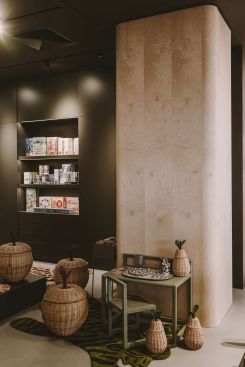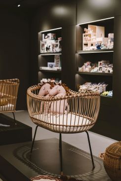 Away from the windows the décor and the tones change towards darker hues – the ceiling, the walls, the racks and the landings are anthracite-coloured. This environment allows the rattan cradles by Bermbach and wheeled plywood display panels to attract immediate and sustained attention. The store offers products created by famous designers in professional studios, as well as articles designed and carpentered by design-crazy parents in the garages of the neighbourhood. So there are many simple and hand-crafted toys, or hand-woven rattan beds, but you will also find references to the future, e. g. interactive toys.