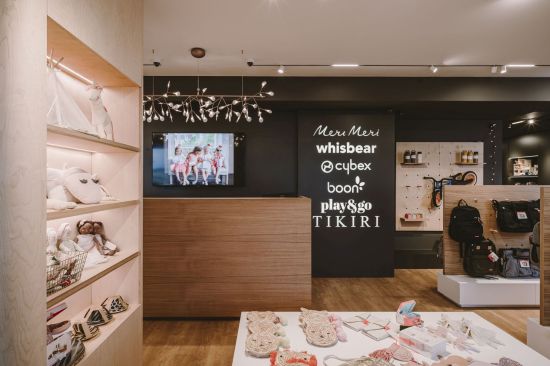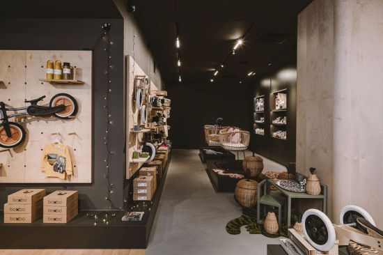 The showroom has 360 square meters and features objects of renowned brands such as OshKosh, Carter´s, SkipHop, Meri Meri, Play&Go, Wishbone, Bermbach, Lonea, Boon, Cybex and Tikiri. The back room has the office, a kitchen and restroom – all attractively designed. The creators have been inspired by the most beautiful children´s boutiques in the world. The colourful and unique objects of the brands represented here are displayed in subdued light and set against an unobtrusive, rather minimalist background. There are many subtle references to nature in the design: ample use has been made of various shades of wood, such as oak and plywood, nuances of grey and white, and concrete. The entire space comes complete with ultra-modern lighting: the luxury brands XAL and MOOOI are state of the art technically and decoratively. In the kitchen, minimalism prevails: walls and cabinets are decorated in dark anthracite, contrasting with the bright colours of the floor, counter top and bar stools. Large glass panels separate the kitchen from the hall.