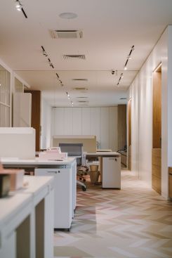 All the walls of the showroom are covered with furniture or panels. The wall areas adjacent to windows are finished with white MDF panels. The floor is an attractive mix of wood and concrete. Free-standing furniture is finished with oak veneer, white varnish or plywood. Construction poles wrapped in flexible plywood also draw the attention of customers and conduce to highlight the objects on display. To highlight the gorgeous objects by Meri Meri they are displayed on three oak wood tables, each lit by huge towering lamps by the exclusive MOOOI brand.