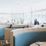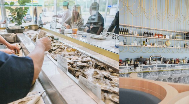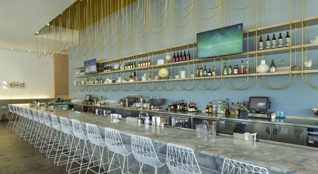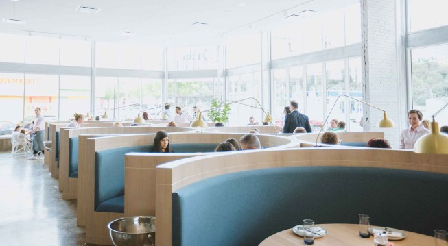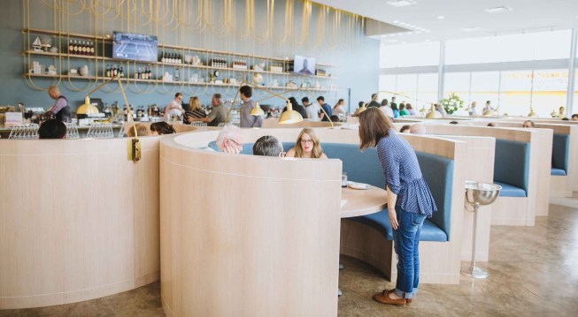 Reinforcing this light and airy aesthetic are the balance and contrasting weights of the furniture and fixtures in the restaurant. The backbar serves as a focal point, grounding the space’s subtly nautical aesthetic. Circular white oak booths seem to float through the open central dining room as if to transport guests on a cozy dining journey.