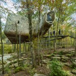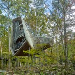 The mysterious form, creative play of shadow and light and sound, exploration of material, and adventure that the Tree House provides becomes a magical experience within the Ouachita Forest…easily bending among native pines and oaks.