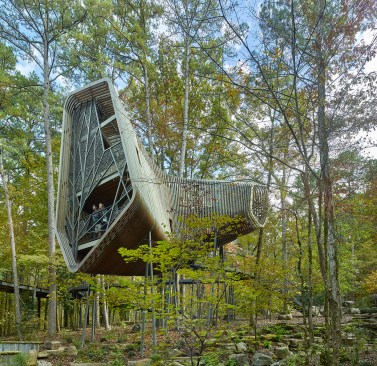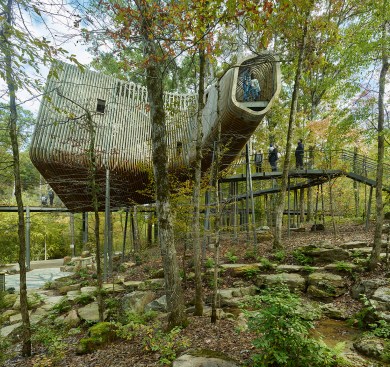Nestled in a natural Ouachita Mountain hillside along Lake Hamilton at Garvan Woodland Gardens in Hot Springs, Arkansas, the Evans Children’s Adventure Garden welcomed a new tree house to the grounds in summer of 2018. This tree house is the first of three planned for the garden that will provide an interactive educational experience for visiting children as part of an ambitious plan to bring children back into the woods. The tree house uses a rich visual and tactile environment to stimulate the mind and body to strengthen connections back to the natural world, while accommodating the needs of all users.