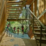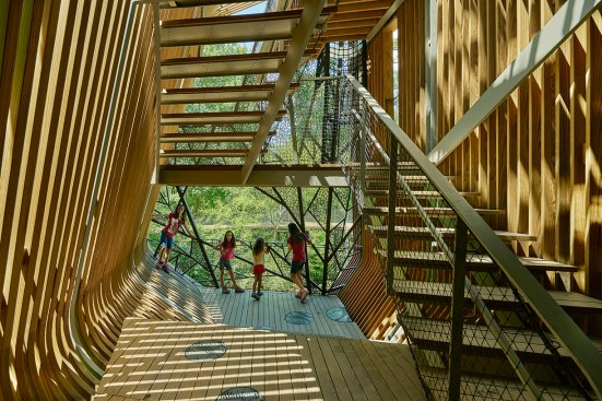 The underlying theme of dendrology, the study of trees and wooded plants, drives both the form and program of the structure. The 113 fins comprising the thermalized Arkansas-sourced Southern Yellow Pine screen creates a semi-transparent and an evocative form dynamically shrouding multiple levels of spaces for children and adults alike that refocus attention to the natural wonders of the forest canopy.