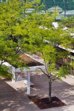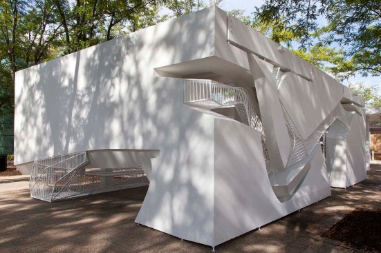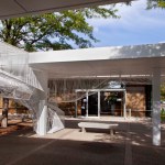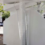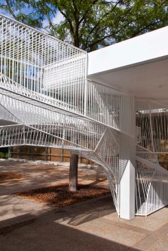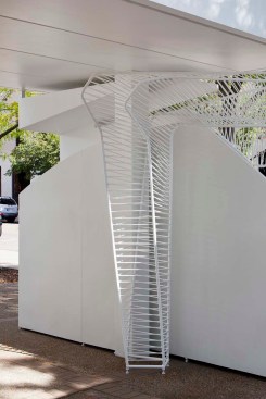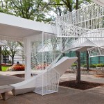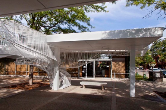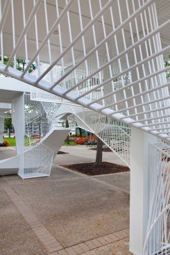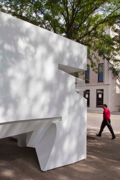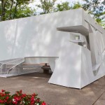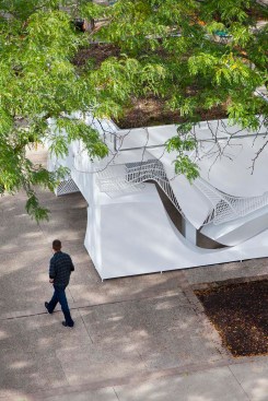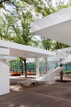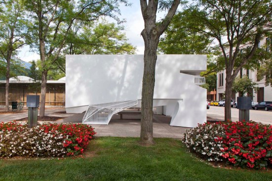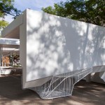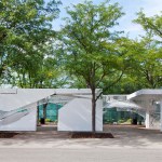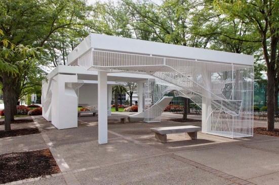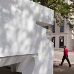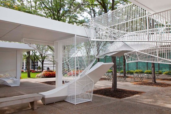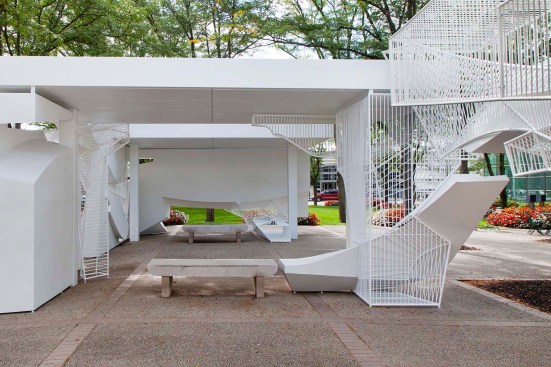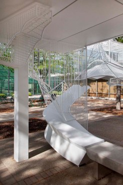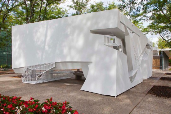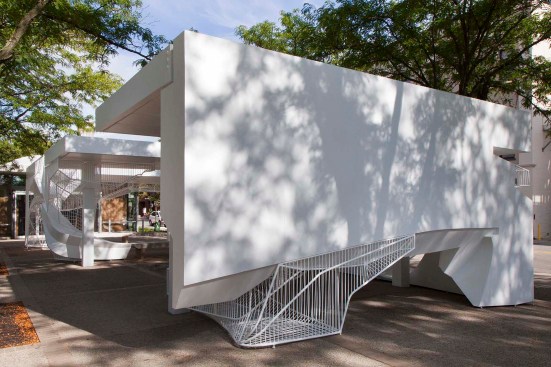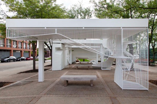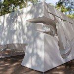 Oyler Wu Collaborative’s research into Eero Saarinen’s oeuvre leads them to focus on three key concepts: Euclidean geometries, solid/void relationships, and tectonics. Their design fabricates a new space within the site by completing the geometries implied by three canopies, legacies of the Irwin Conference Center’s history as a drive-up bank. The rectilinear space, defined by the existing canopies and completed by new walls of welded steel — some solid, some sketched in lines or carved away into voids — is enlivened by sophisticated tectonic interplay with embedded objects derived from Oyler Wu’s particular idiom. The resulting complex of canopies, walls, and benches produce new areas of containment and new points of destination.