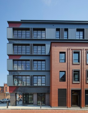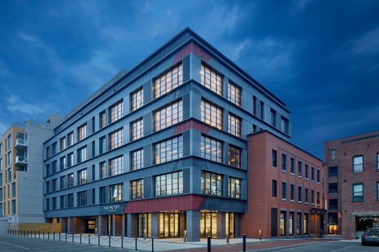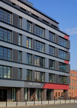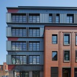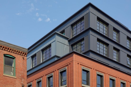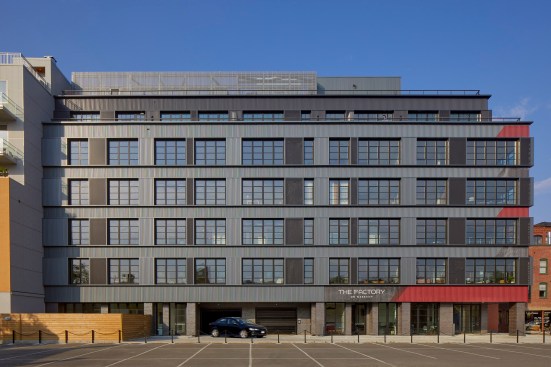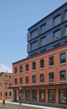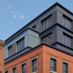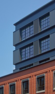 The Factory Lofts is a new mixed-use project in Boston’s South End. Located at 46 Wareham Street within the South End Landmark District protection area, the project includes a new brick façade that reinterprets an existing three-story, 19th-century brick warehouse that originally occupied the site; a new, three-story metal-clad addition rises above the brick base building to a height of 87 feet. Located in a mixed-use neighborhood, the building comprises both commercial and residential units, including office and ground-floor retail space and 15 loft-style residences, some with outdoor terraces and folding glass walls. 22,000 SF of commercial space replaces the use of the previous, dilapidated warehouse structure. The expanded footprint includes on-site, automated underground parking for 57 vehicles. A new, industrial-style steel canopy lines Wareham Street and leads to two lobbies, serving the commercial and residential spaces.