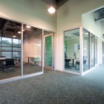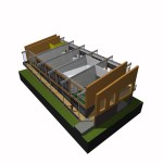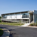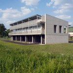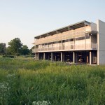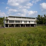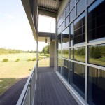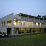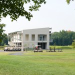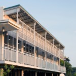 Developed for the Maryland National Capital Park and Planning Commission, the Performance Center is separated from the main clubhouse by an entrance drive, creating an effective gateway to the golf course. Built on a limited budget and located on a flood plane, the building is raised on masonry piers that also provide space for secure golf cart storage. An accessible ramp provides access to the main level. Hung from the roof on steel rods, it wraps around the building providing golf course views in all directions. Louvered panels and large roof overhangs mitigate the effects of the sun and create a multi-layered façade composition. Modest, renewable materials accommodate high traffic use.