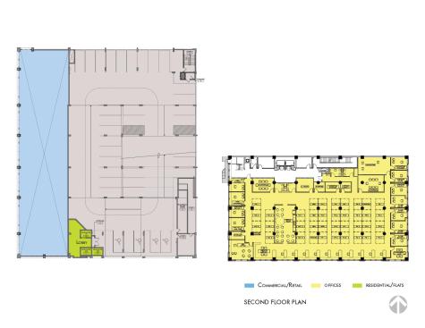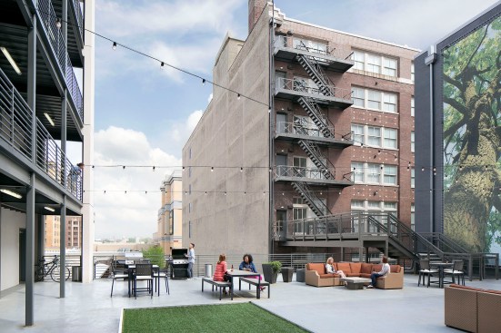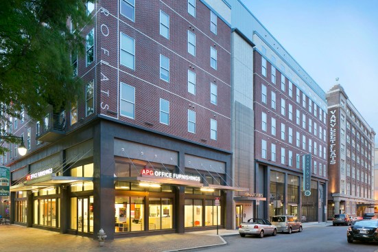 The five-story infill building contains 7,000 square feet of ground floor retail and 92 apartments on upper floors. The seven-story historic building features 17,098 square feet of ground-floor retail and office, including the renovated corporate headquarters of a local company, and 60 loft-style apartments above. Today the two buildings are connected by an elevated courtyard and residents of both communities share access to a fitness facility, the parking garage, and the two buildings’ retail offerings. The industrial-sized windows and meticulously preserved façade of the historic building accentuate its prominent street corner position and inside, high ceilings, original warehouse concrete columns and concrete floors all tie together to keep its past intact. Indoor/outdoor relationships are maximized in the infill building with upper floor residential units overlooking the private courtyard or engaging the urban street with balconies and large operable windows. Historic and contemporary combine in a harmonious design.