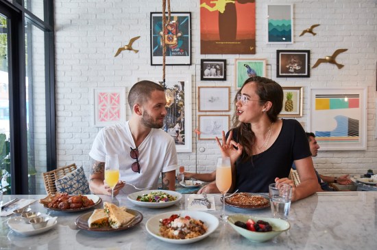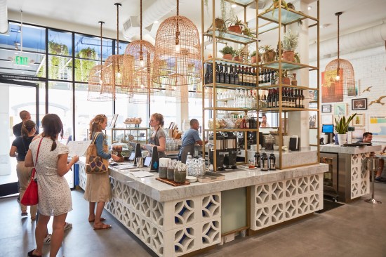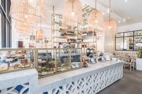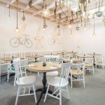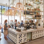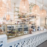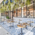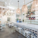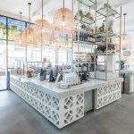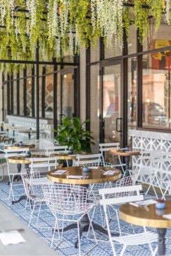 The Gables is inspired by the story of a local Santa Monica Beach Club of the same name that was never fully completed in the 1920s. Working with Mystery, an award-winning Branding/Design agency, our aim was to create the feeling of an independent community eatery, that represented its locality in beach-side Santa Monica. We used a range of materials to give a contrast of everyday finishes, such as white-washed wood, glazed tiles and mid-century air-bricks with aspirational touches of brass, poured concrete for the flooring and Carrera marble for the counter-top. The concrete bricks around the bar and takeout area were inspired by those overlooking Santa Monica beach and the design of the gate was inspired by the gates in Palisades Park. A vertical garden flanks the patio wall, with cascading greenery adding color and texture to the restaurant’s Santa Monica beachy aesthetic.
