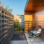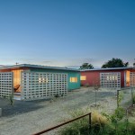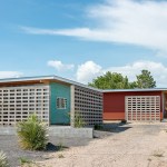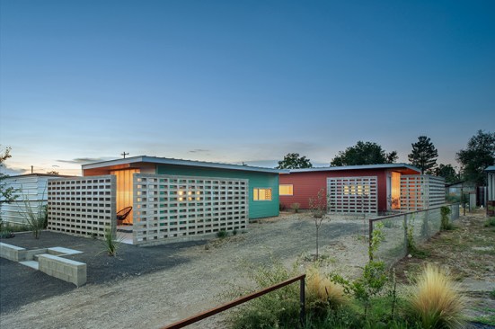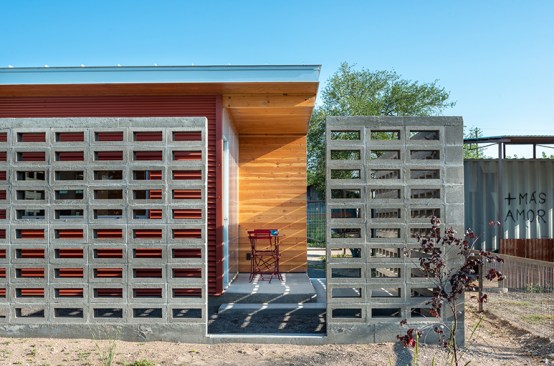 But on closer inspection, elements of the local vernacular, tweaked into compelling visual and practical effect, begin to appear. The siding is painted in mellow shades of turquoise and maroon; the roofs extend slightly beyond the volumes to provide a shaded porch over the translucent living-room façades; and that most humble of materials, concrete cinder block, forms walls that fold around the porches and screen side windows, giving residents both enhanced privacy and a little protection against the harsh West Texas sun.