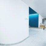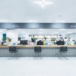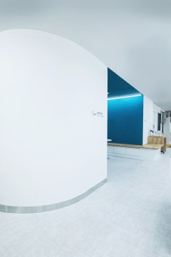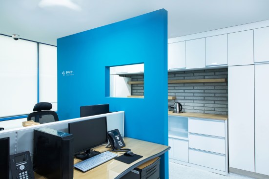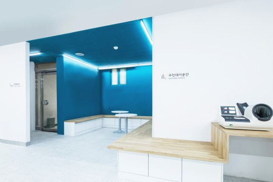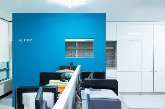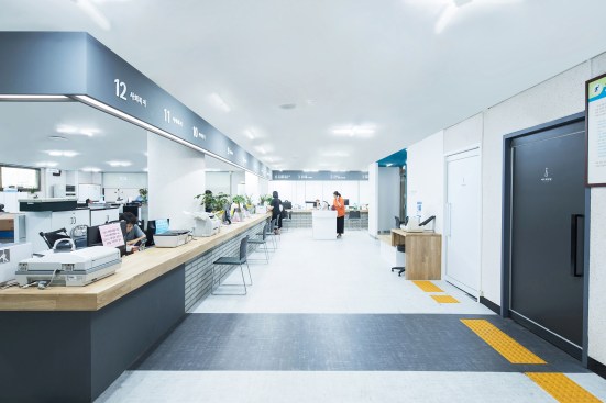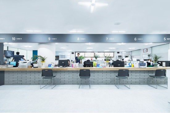 Previously, the waiting area had one long chair to seat three people, and the staff’s office space and the public service space were combined, creating a poor environment for work efficiency. Also, the consultation room was being used as a warehouse. After removing the resident registration room and consultation room, we moved the main space to the upper floor leaving only essential documents and space. The public service desk was installed following the circulation that connects the two yards, separating the office space from the public service space. The consultation room was changed into a public service waiting area. The Samyang-dong Community Service Center has more welfare counseling for vulnerable groups than simple public service, so the public service desk was lowered to a level at which the staff and resident can speak at the same eye level. The Gray Band partially conceals the office space, helping the resident and employee concentrate on their consultation.