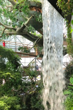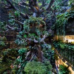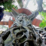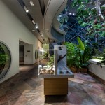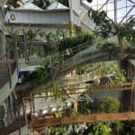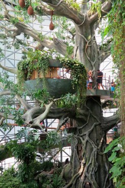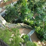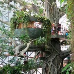 Upon the completion of this immersive aquarium experience, visitors ascend to the upper reaches of the Building via high speed lifts to emerge at the upper branches of the Kapok tree where they descend down a series of spiral ramps around, and within the biome, to discover the varied habitats of tropical rain forest, from the butterflies and birds within the canopy of the tree, to the snakes and leaf cutter ants on the rainforest floor. Upon the completion of their visit, guests then cross over the river they began their journey and descend down to grade via escalators to the Visitor Centre and lobby.