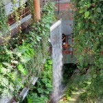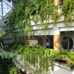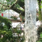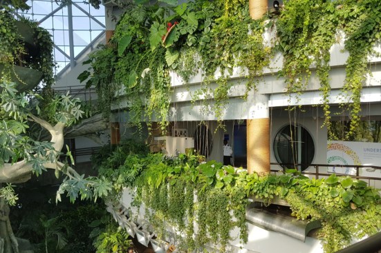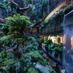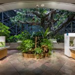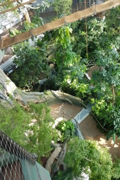 Visitors enter The Green Planet at grade level and begin their journey through a flooded rainforest river, containing an aquarium and grotto with fresh water fish, set within eroded riverbanks of the Amazon, containing ferns and mosses from the region to gain insight into the foundation of the Kapok trees emergence within the Rainforest and how the river is the progenitor for the evolution of co-dependent species above.