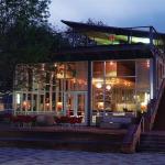 The exposed steel frame conveys the building’s structural rationale and gives a background syncopation to the spaces. Detailing is crisp and precise. Wood ceilings formed by installing cedar planks in the bottom flanges of the spanning members bring warmth to the dining space. Wooden floors extend into surrounding outdoor decks, and beams terminate in supporting brackets for the roof overhang, drawing inside and outside into continuity. Low-level interior lighting allows for outside views to be prominent, day or night.