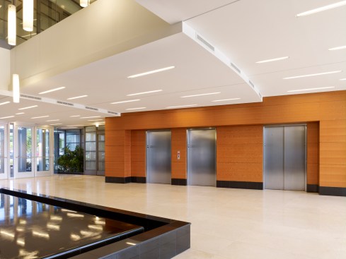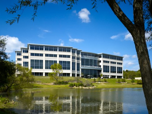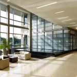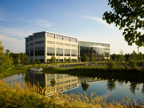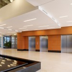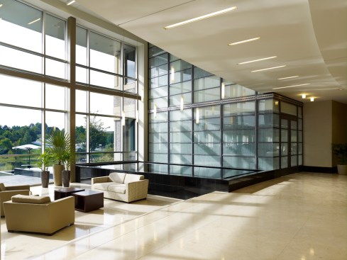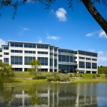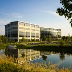 This five story 150,000 SF office building houses a regional headquarters for an international insurance company. The exterior is precast concrete panels with sandblasted and exposed aggregatefinishes; curtainwall and strip window systems with custom aluminum cap extrusions and composite aluminum panels forming the roof cornice and overhangs. The interior design incorporates a main lobby with a two-story step down atrium and water features which extend thru the curved curtainwall to the exterior plaza overlooking a pond. The third and fourth floors are connected with a repeated two-story atrium opening to a curved balcony. Completed on a fast track schedule the project has received LEED Gold Certification.