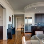 The clients wanted the existing kitchen relocated and hidden from sight. Pre-construction investigative probes located pipes in a building chase with sufficient space for a new, walk-through galley kitchen with direct access to the dining area. A dry-bar off the main living area acts as a wine bar and auxiliary servery space when entertaining.