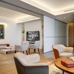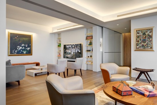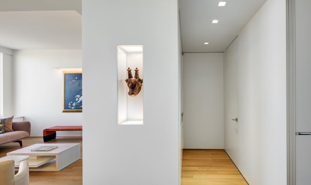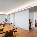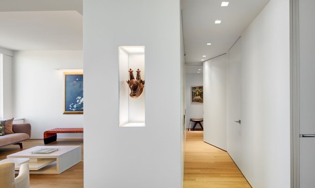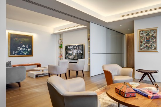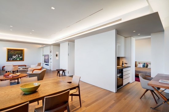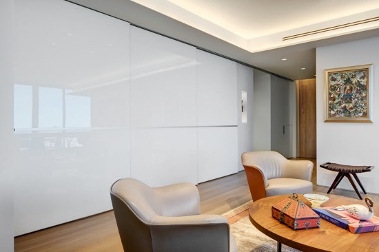 A welcoming mask floats in a northeast-facing niche at the central axis of the apartment to protect the occupants from evil spirits. The layout locates the master bedroom in the southwest quadrant for strength in love and marriage and situates the parents/guest bedroom along the northwest axis for mentors/helpful people. The den area can be separated from the main living area into a bedroom to house additional guests with a series of three interlocked translucent sliding panels that span twenty-six feet.