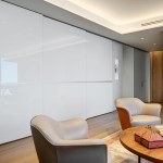 The lighting scheme enhances spatial qualities and helps define functions. Lowered ceilings accommodate structural beams, pipes, ducts, and sliding panel tracks. At the transitions between ceiling heights, wall-mount soffit coves with integrated LED strip lights become a visual highlight and define the large open rectangular public space.