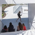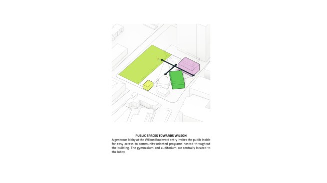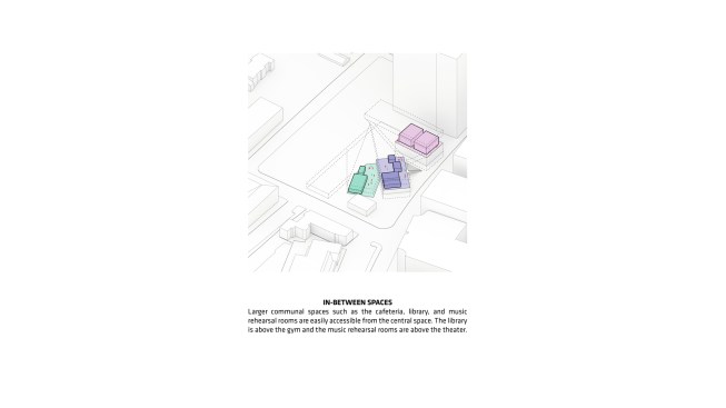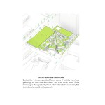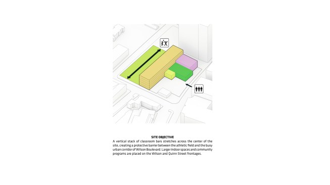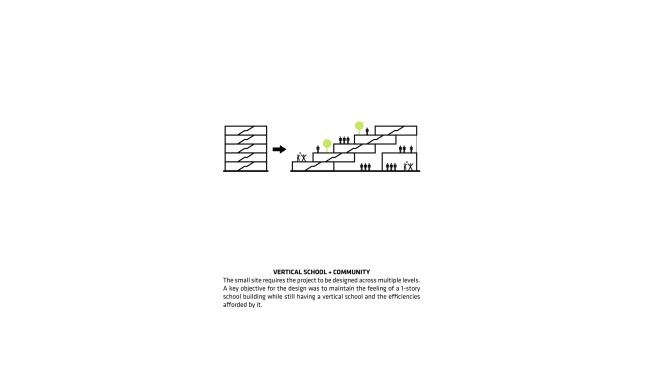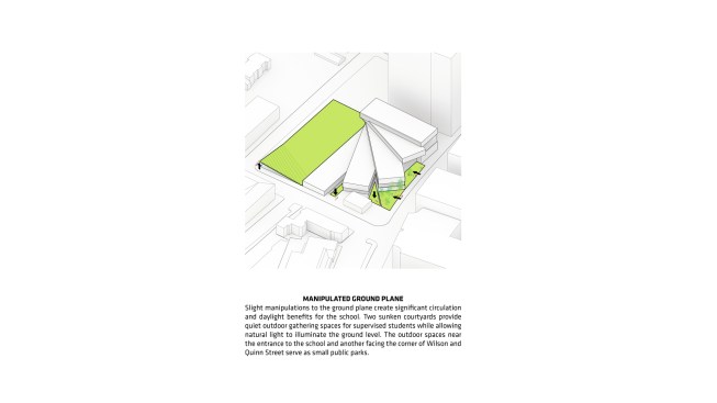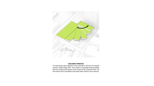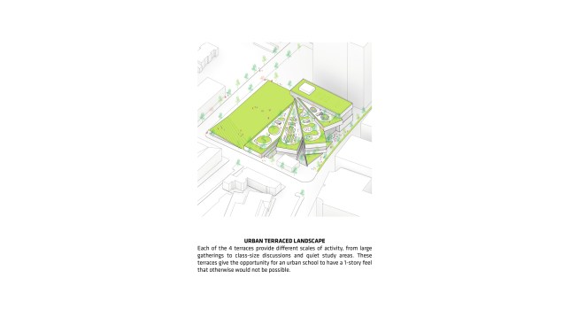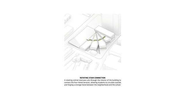 Situated within a compact urban site bounded by roads on three sides and a portion of Rosslyn Highlands Park, The Heights is conceived as a stack of five rectangular floorplates that rotate around a fixed pivot point, maintaining the community feeling and spatial efficiencies of a one-story school. Green terraces above each floor become an extension of the classroom, creating an indoor-outdoor learning landscape for both students and teachers — an educational oasis rather than a traditional school setting. A rotating central staircase cuts through the interior of the building to connect the four-tiered terraces, allowing students to circulate outside and forge a stronger bond between the neighborhood and the school. While the upper terraces are more suitable for intimate classes and quiet study areas, the spacious first terrace and 18,700sf recreation field also serve as public event venues for school-wide and neighborhood activities.