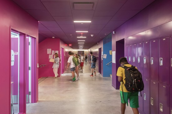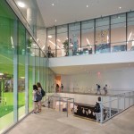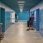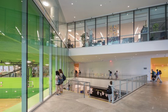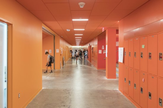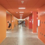 From Wilson Boulevard, students, teachers and staff are greeted by a triple-height lobby with stepped seating that double as an indoor gathering space for both student assemblies and public gatherings. Many of the school’s common spaces, including the 400-seat auditorium, main gymnasium, library, reception and cafeteria, are centrally located and directly adjacent to the lobby. Easy accessibility to the community-oriented programs hosted in the school encourages public interaction throughout the building, creating a welcoming environment while heightening the visual connectivity between the shared spaces. Other specialized student spaces include an art studio, science and robotic labs, music rehearsal rooms and two performing arts theaters.