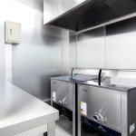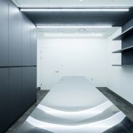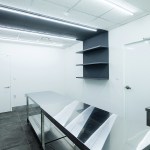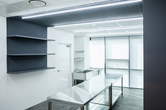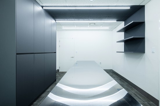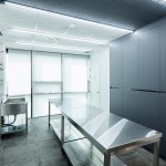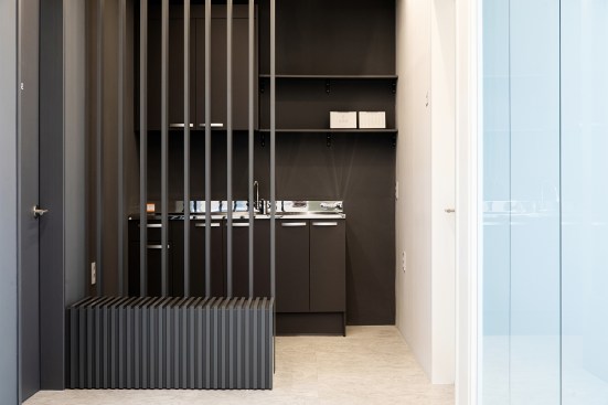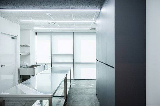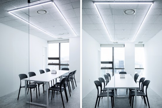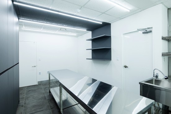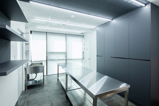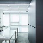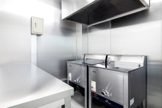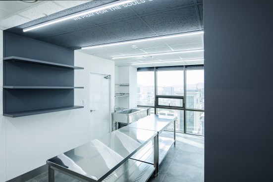 The frying room and kitchen with oil-filled frying machines were separated and a long, wide workstation was placed in the kitchen in the middle. Rather than a large space, short and dense movements were important as it was a place where people worked standing all day. The tested product was directly connected to the conference room to be evaluated with several employees. Comforting the souls of countless chickens tested here…