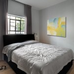 In the private section of the home, a master suite was designed with an adjoining bathroom, an additional bedroom, and a separate bathroom. The bedroom windows were enlarged to maximize natural light intake. The bedrooms were designed in a minimalist style that meets all their needs. The floors are covered with warm wood parquet.