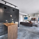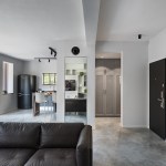 Despite its relatively small size, Zeldman chose dark hues and a minimalist design for the kitchen, as it is used mainly for preparing light meals rather than extensive cooking. Through wood frames undergoing a charred process and monochromatic color schemes, Zeldman gave depth and character to the black kitchen. The refrigerator serves as a central design motif, and the wall leading to the dining area is painted in black, intended for writing with chalk. Circular black ventilated air ducts were integrated into the upper part, providing an industrial look.