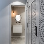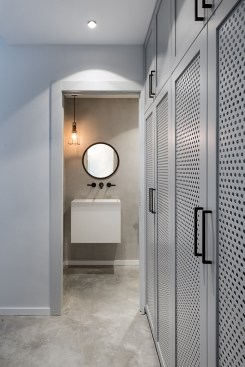 In the hallway leading to the bathroom, a service cabinet made of wood frames and perforated metal grille was incorporated, concealing the washing machine and dryer inside.