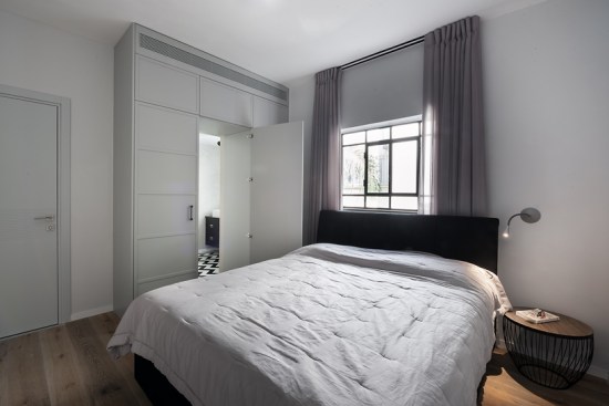 In the master suite, beyond the bathroom, Zeldman creatively placed a custom-made carpentry unit within a wall cabinet, tailored to the space’s needs without sacrificing storage places.